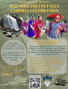 Oregon City, Oregon -- The second annual Willamette Falls Lamprey Celebration on July 13th, 2023 was a huge success for the Yakama Nation in highlighting the collaborative work between tribes and key organization in restoring asúm; engaging with treaty tribes and Portland, Oregon community and; most of all, celebrating the historical tribal harvest of asúm (eel-like lamprey) at Wa'lmút (Willamette Falls) -- where Yakama Nation and other Columbia River treaty tribes (Warm Springs, Nez Perce, and Umatilla) have treaty-reserved rights to harvest.