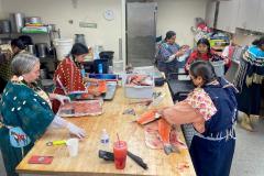 Lottie Sam, front right, and other women prepare salmon in Toppenish, Wash., before a ceremony held by the Confederated Tribes and Bands of the Yakama Nation. Credit:Tony Schick/OPB