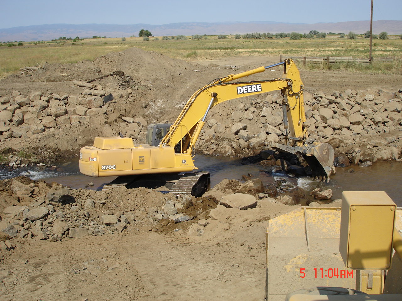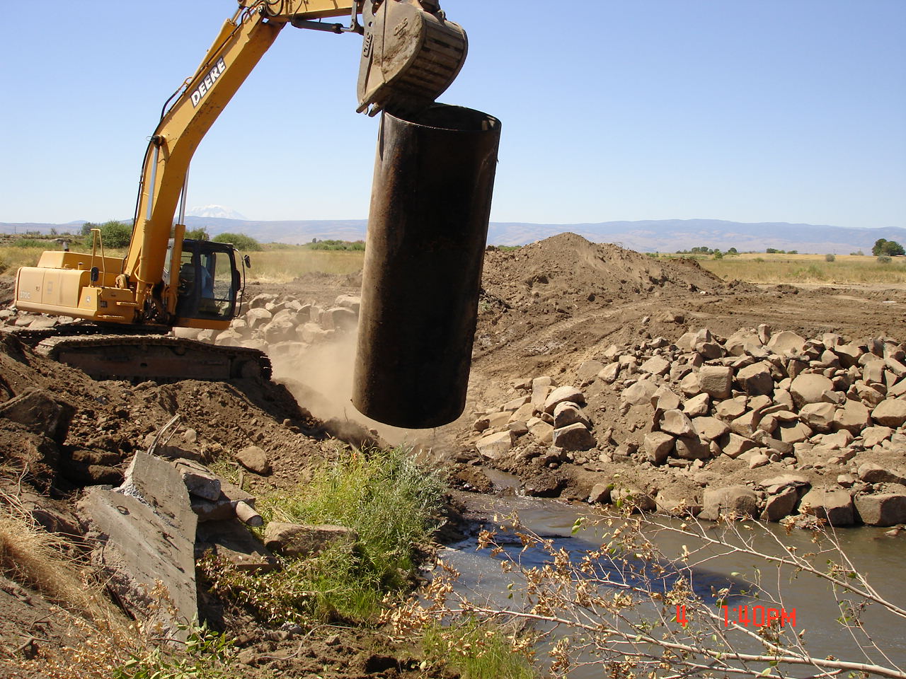 Rock for this project was staged onsite prior to beginning the work. The rock was delivered by side-dump semi truck and sorted and placed in piles. A tracked excavator was used to remove the concrete debris and the culvert. The excavator was also used to place the rocks that formed the grade control.