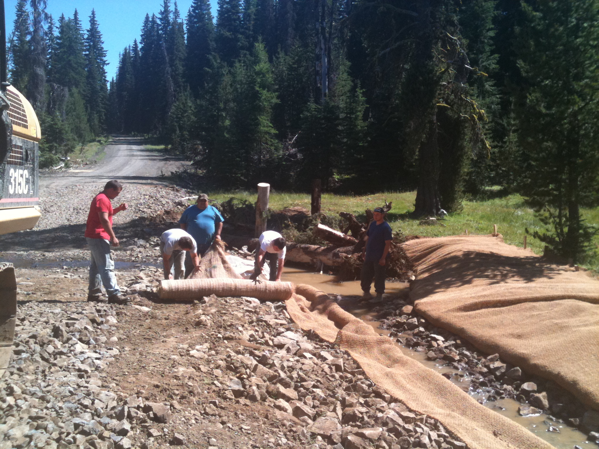 YRWP removed the existing double culvert configuration and replaced it with another armored rock ford. The construction was completed at an angle and grade approved for vehicle travel including trucks and logging equipment. Equipment used for construction included a small excavator, a dump truck, a water truck, and road grader. Areas of the stream channel disturbed during construction were stabilized with a combination of large wood, rock, and coir fabric.