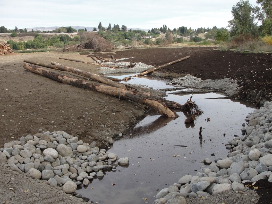 The Sunnyslope side channel project is located on the Wenatchee River at RM (river mile) 1.4. This excavated side channel is approximately 1,350 feet in length. It is connected to a natural side channel of the Wenatchee River at the upstream end and flows into the mainstem of the Wenatchee River at the downstream end. This project goal was to create a groundwater-fed side channel with an upstream connection during high flows (approximately 7,000 cfs). The ground water will provide a cool refuge during hot summer temperatures creating juvenile anadromous salmonid rearing habitat. Based on the natural side channel connected at the upstream end, adult salmonid spawning may also be a possibility within the new channel.