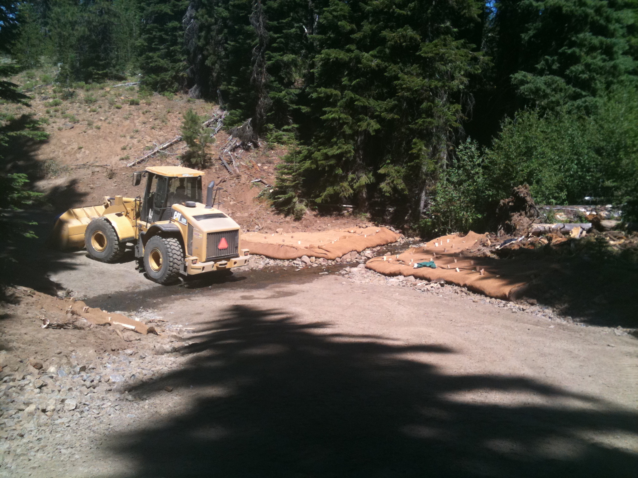 YRWP removed the existing double culvert configuration and replaced it with another armored rock ford. The construction was completed at an angle and grade approved for vehicle travel including trucks and logging equipment. Equipment used for construction included a small excavator, a dump truck, a water truck, and road grader. Areas of the stream channel disturbed during construction were stabilized with a combination of large wood, rock, and coir fabric.