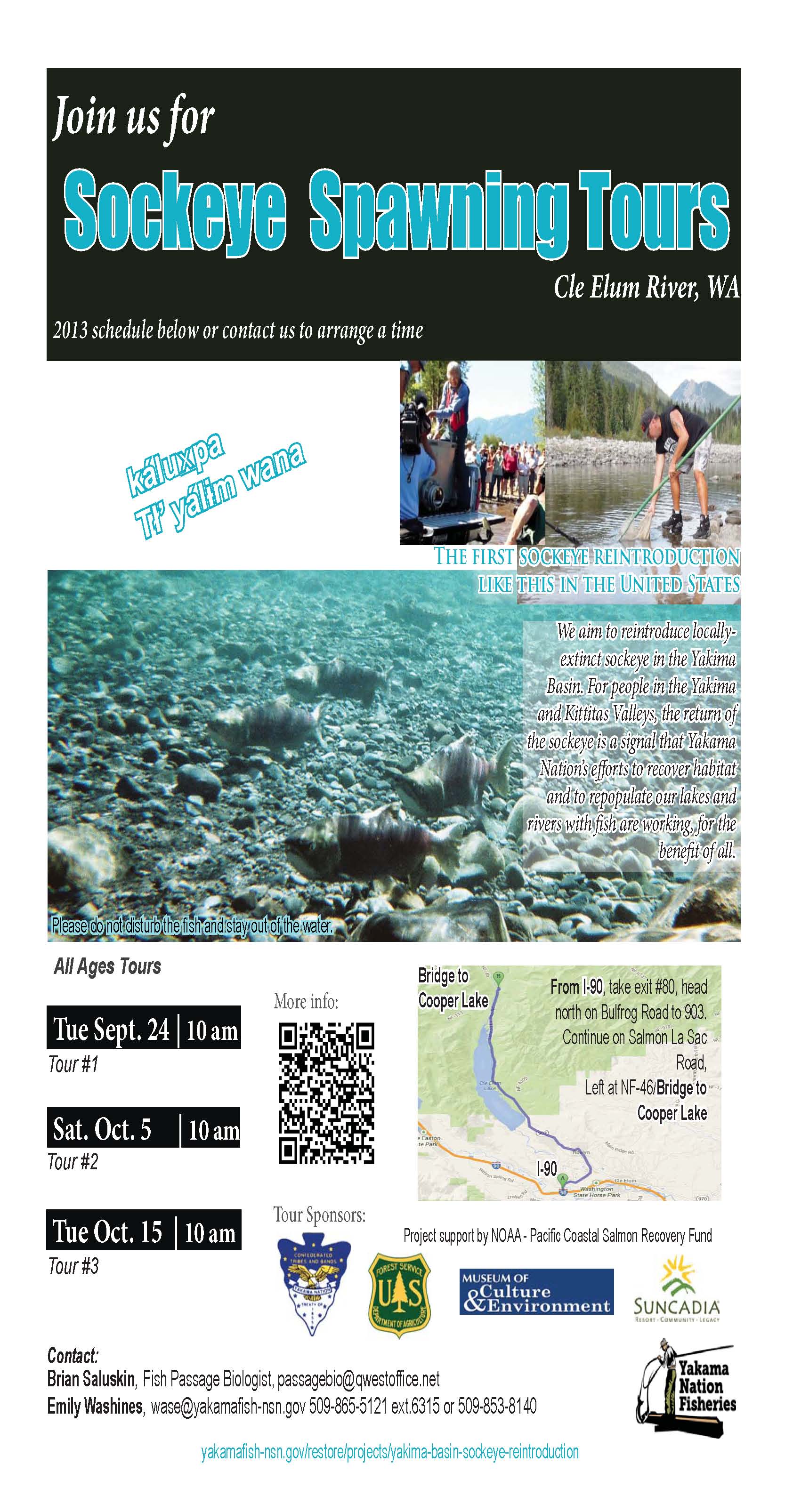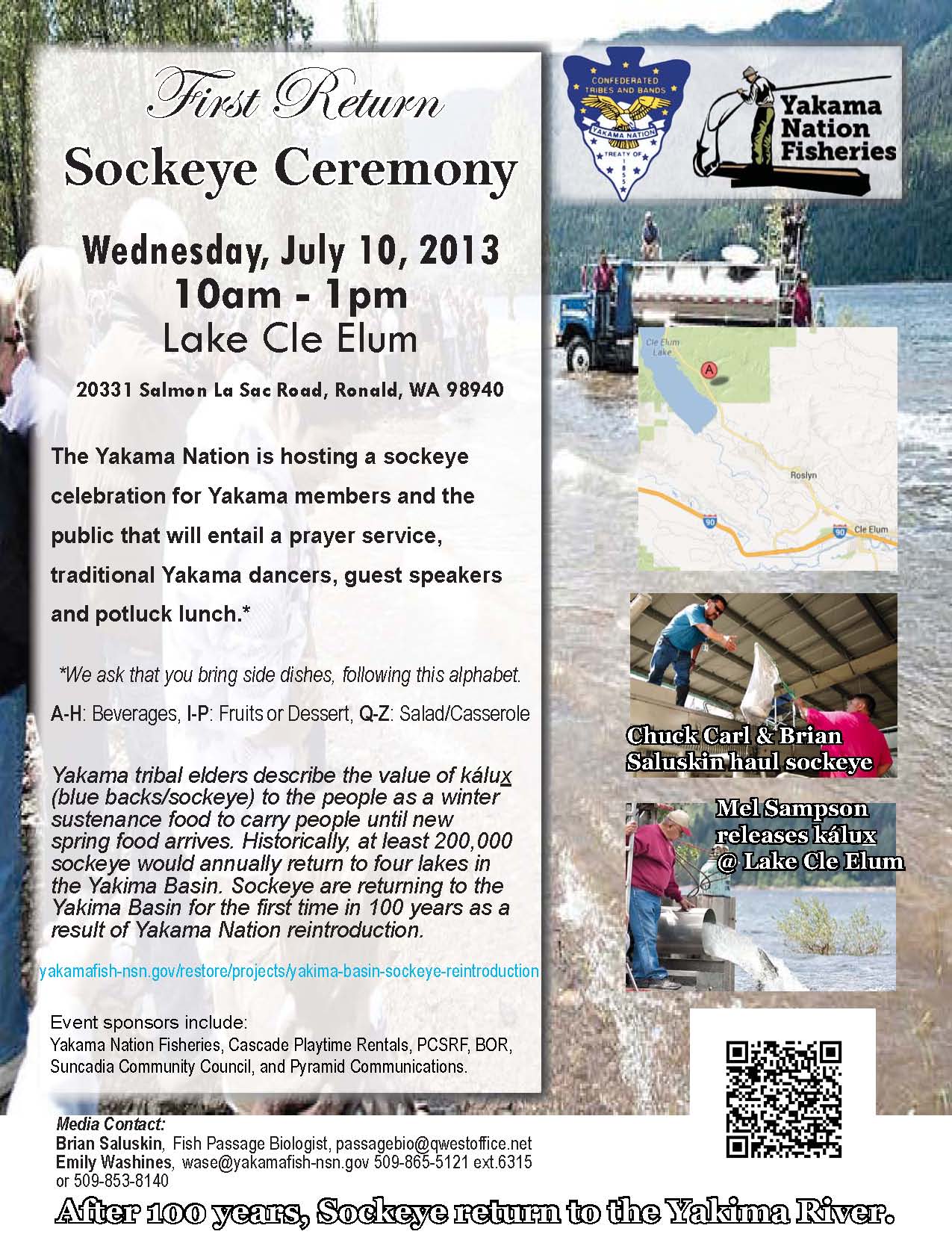 Thousands of adult sockeye have been transplanted to Lake Cle Elum since 2009. The sockeye successfully spawned in tributaries above the Lake in all years and the first native-born sockeye have returned to the Yakima Basin in over 100 years. A juvenile passage structure is now under construction that will allow juveniles to migrate from the lake regardless of water level. The structure is expected to be operational by 2023. Adults returning to Cle Elum Dam will be transported above and released in the Lake to continue on to the natural spawning grounds.