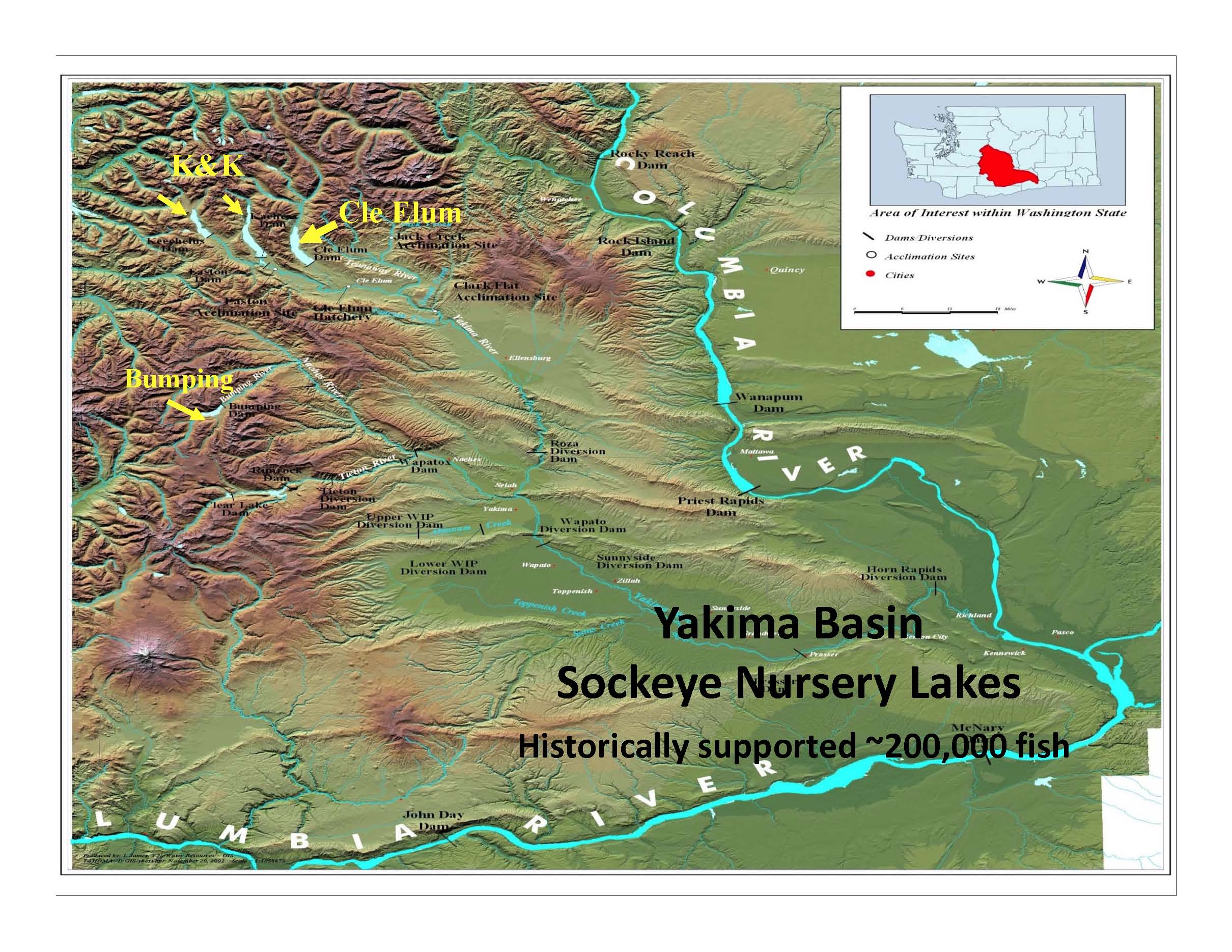 Four nursery lakes in the Yakima River Basin, which historically produced an estimated annual return of at least 200,000 sockeye, were removed from production in the early 1900s when irrigation storage dams were constructed without passage. The Yakama Nation is working with the U.S. Bureau of Reclamation and other Yakima Subbasin partners to restore fish passage to all of these historical lakes with initial emphasis on Cle Elum and Bumping lakes. A preliminary juvenile passage flume was constructed and tested at Cle Elum Dam in 2006 and 2007. Based on the success of this and other prior work, the Yakama Nation negotiated an agreement with the U.S. v Oregon parties to transplant adult sockeye from Priest Rapids Dam to Lake Cle Elum contingent on run size.